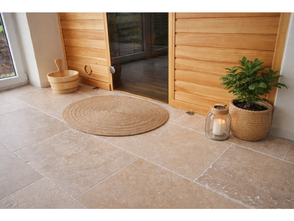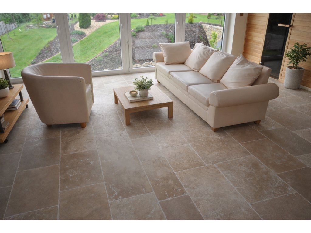 Přírodní travertin v teplých béžových tónech, netmelený povrch, ideální do interiéru i domácího wellness. Vhodný pro podlahové topení.